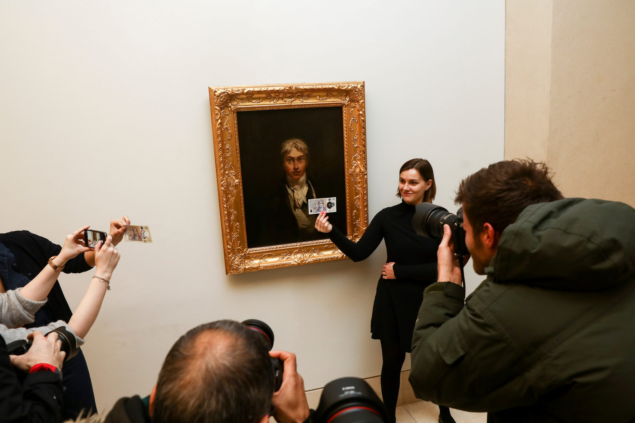 An employee poses with the new 20 pound note featuring artist J.M.W. Turner in front of Turner’s self portrait at the Tate Britain in London. Photo by Simon Dawson/Reuters